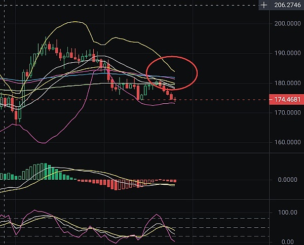 SOL1小时来看,所有均线都在币价上方形成压强,价格持续向下接近布林带下轨;2小时线关注EMA180支撑位,4小时线关注EMA120支撑位;操作建议高空为主,178上方空是最稳妥的;行情瞬息万变,请带好止盈止损,见好就收!