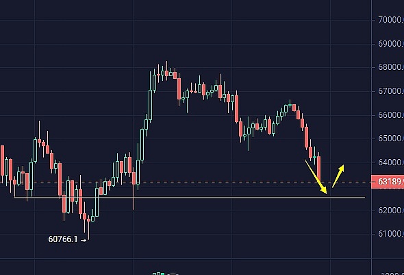 没想到今日比特币在66650一线承压之后小时线迎来了一波连阴单边下跌,盘中截止目前已经连63000关口都已失守,几乎回吐了周四凌晨利率决议后的涨幅;日内文中,我们分析日线经过大阳反弹之后,昨日收阴调整,如果日内继续连阴并回吐周三阳线的话,那么日线触顶后的反转走势将继续得到延续,61000的关口支撑都岌岌可危。