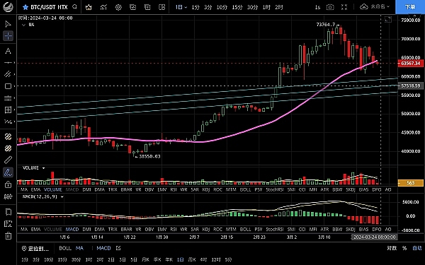 大饼整体走势偏向震荡,昨日最高触及66630一线受阻回落,期间虽有反弹但未能站稳再次回落,最低至62300一线支撑,目前币价在63520附近运行,四小时级别行情连阴下行再次试探ma200均线支撑,虽有反弹但上方受ma7压制再次回落,macd死叉向下,目前走势还有下行需求,若跌破有ma200则有下探前低的风险,日线来看关注6w关口支撑当心插针,留好仓位,若急速下跌可分批补仓,若稳在6w上方预计调整完还是要冲击新高的,继续低多持有,上方压制64500-65800,下方支撑62500-61500