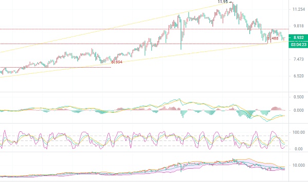 四小时超短趋势处于横盘阶段,上方波动区间首先,K线上行触及EMA9.3支撑点后回撤下来,MACD暂时出现了放量的一小一大,向下交替不用担心,如果出现了一大一小空就可以顺势进场了,目前放量结束开始缩量修整,KDJ开始收口,布林带今日支撑点关注8.67,压力位关注9.1,