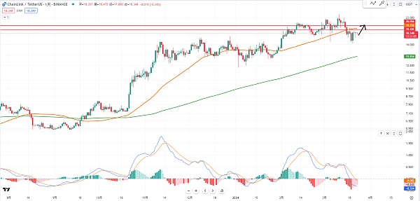 同时这也是中长期的阻力位和支撑位,另外下方MACD更接近于买入信号。也就是快慢线即将出现看涨金叉信号,这表明 LINK的价格可能会在这个周末有上涨势头,我个人认为这可能在和后期也会将价格拉升至20美元以上。