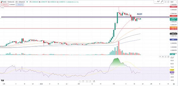 总结一下,柴犬币目前已经表现出了比较好的上涨势头,同时也企稳了下方的支撑位,这表明了看涨突破的可能性依旧比较大。随着新的看涨趋势出现,柴犬币的价格可能会进入关键阻力区20MA,这可能也是为了上涨到更高的价格做准备。