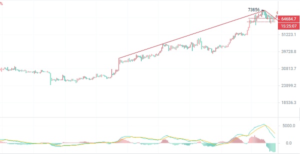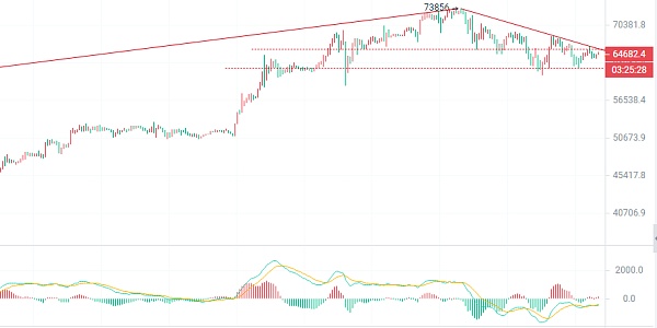 祝贺各位又一次成功抓住了这波行情,成为了一名成功的收割者。只要保持稳健的心态,正确设置止盈止损,培养良好的交易习惯,就能在市场中取得稳定收益。昨日的行情完全符合我们的预期,由于上方无法突破66000点,我们建议大家在66000点附近布局空单,止损设定在66300点附近。因为一旦突破66300点,多头趋势将确立。最终我们成功地在64000点获利了结,实现了2000点的收益。随着减半事件的临近,许多粉丝都翘首以待,我们依然坚信只有耐得住寂寞,才能守得住繁华。