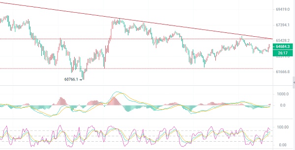 四小时超短趋势中,K线已突破EMA趋势指标并站上EMA移动平滑指数,预计短期内将冲击65700压力位后回落。MACD显示成交量放大,DIF开始向上冲击0轴线,而DEA尚未跟上,说明多空双方仍在争夺主导地位。KDJ指标显示布林带收口许久终于开口,K线也有望站稳布林带上轨附近,趋势呈现向好迹象。因此,在操作思路上应更加灵活,密切关注上方压力位,若未突破可继续布局,反之亦可在突破时顺势跟进。