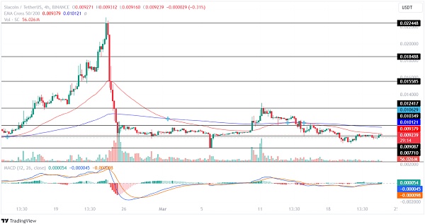 如果近期价格保持在0.00908美元的支撑位以上,那么SC将重新出现上涨势头并在未来一个月内也有可能会测试0.0155美元的上方阻力位。反之,如果近期未能企稳0.00908美元的支撑位,价格就将会下跌并测试0.00771美元的低点。