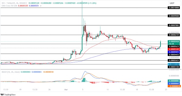 指标方面MACD显示持续上升的绿色柱状,表明了市场上看多情绪正在增加。另外EMA50/200均线也可以看出上涨的趋势明显,这也表明了XEC币在未来的时间内将会继续上涨。