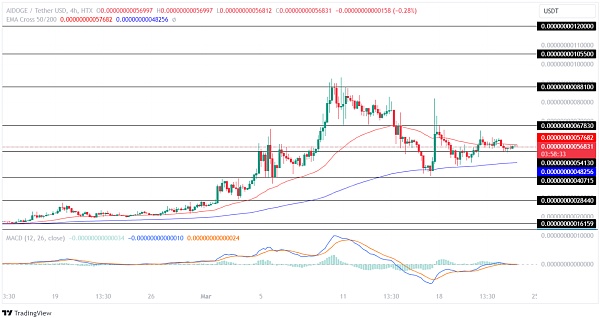 指标方面,从MACD上面可以看到持续的平行线,也突出了市场的买盘和卖盘压力较弱。另外EMA50和EMA200均线的趋势也比较偏中立,也表明未来AIDOGE的价格似乎会飘忽不定。