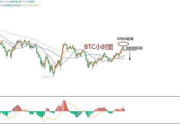 3月25日比特币(BTC)合约技术面分析:今日方面,大周期日线级别昨日报收小阳线,K线形态连阳单阴,价格在区间内震荡,附图指标死叉运行,短时间内价格还是处于弱势走势,交易方面继续保持短线,同时注意反抽力度过大风险,交易是长期性的,不急于一时;短周期小时图凌晨价格上涨,高点位置67650区域附近,早间承压回撤,当前K线形态连阴下跌,附图指标多头缩量运行,快慢线有粘合死叉迹象,那么日内还是有回撤需求的,因此今日BTC短线合约交易策略:现价66550区域直接空,止损66900区域,目标看65500-65300区域;