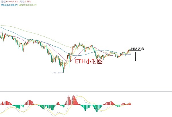 3月25日以太坊(ETH)合约技术面分析:今日方面,大周期日线级别昨日报收小阳线,K线形态连阴单阳,价格在均线下方,附图指标死叉向下,大趋势上目前还是弱势走势,但整体是在大区间内震荡,交易继续保持短线,不要过分的去看多或者看空,现货暂时观望即可;短周期小时图凌晨价格冲高早间承压回撤,当前K线形态连阴,价格在均线下方,附图指标多头缩量,快慢线有粘合死叉迹象,那么日内还是有下跌需求的,因此今日ETH短线合约交易策略:现价3437区域直接空,止损3465区域,目标看3370-3340区域