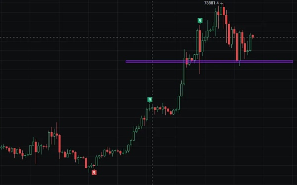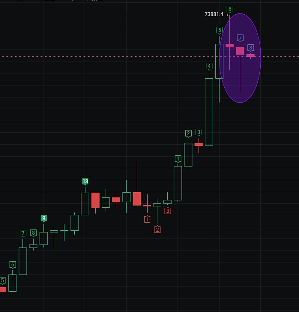 近期一直调整,但有一点从未改变,那就是73881的高点一定会被再次突破,在减半和降息之前,牛市不会轻易结束,只是前期涨得太快,近期需要调整修复,仅仅看做调整行情。一般而言牛市中调整20%是最佳的入场时机,也就是价格在60000附近以及59000区域,如果能到达一定是现货合约大量布局趋势单的机会,这点我一直在强调,上次给了一个短暂的机会,入场了一部分,下去依旧可以接。