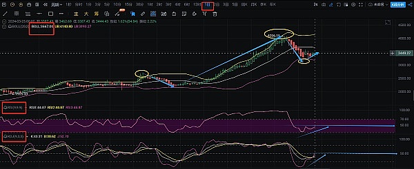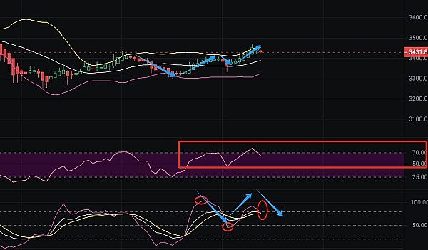 RSI买卖强弱指标趋势(紫色)当前冲破中轴50值向上运行至70值多头区间附近。价格指数相应的也会在布林带4小时中轨3380为理论底部向上展开震荡走势为主。KDJ指标中J线当前在K,D周期线上方反转上行,对于短期3380-3510震荡走势也有很强的技术支撑
