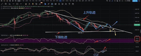ETH日线走势布林带分布轨迹;一轮牛市拉升至新高4091附近后,由日线布林带上轨承压回落至中下轨道间维持横盘震荡走势。当前收报3435附近。技术指标方面RSI趋势线当前由25值附近震荡后指向中轴线50值。后续有望价格指数震荡走高至布林带中轨3660附近趋势。同时KDJ指标当前J线上穿K,D周期线后。对于价格走势持续向上有一定的支撑作用!