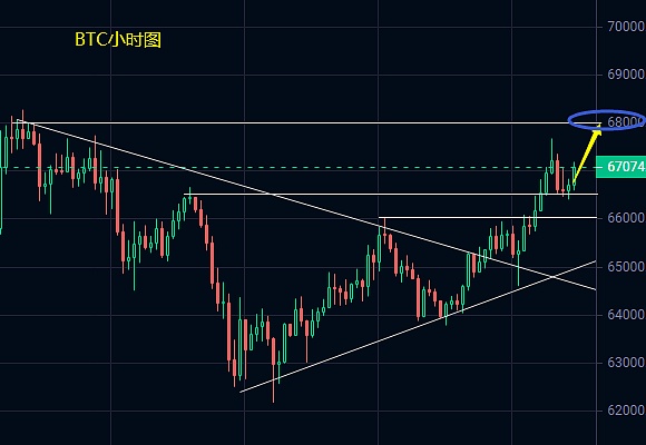 短线上,币价两度探底回踩62500后反抽,昨日更是直接依托64000支撑突破67000关口,小时线保持良好的上涨趋势,早间冲高回落后止跌于66500,日内的话,要么依托此位置继续展开上行,要么再次回踩66000转换位二次反弹,总之,日内上涨的可能性较大,上方重点关注68000关口的突破情况。