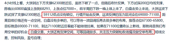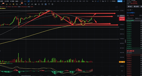 4小时线上看,大饼这波下跌到60800位置是到达下方支撑附近后收线反弹上来,上周周末,4小时线在62300附近收3根十字星,从盘面上解读,空头试探支撑后受阻,行情随后走出反弹,短线高点68293如果白盘突破,行情将会往71000附近去靠,也是上周我们说的大饼反弹的压力附近,到达71000附近,如出现收很长上影线的情况就可开空,未出现就有可能再度刷新高点,近期行情需要关注的高点就是71000压力,白盘行情继续走反弹的机会更大,69000是第一目标位置,随后是71100附近,自行把握进场机会;短线交易,控制风险,盈亏自理;