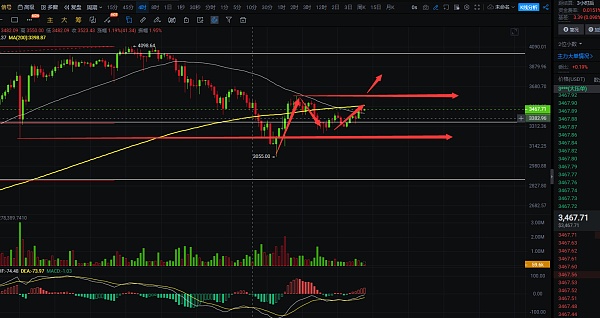4小时线上看,以太前面的下跌是更弱一点,跌破前面低点,到3055后行情走出的反弹也是比较弱的,以太周末的下跌也是在下方收长下影线,这波短线回调的力度也不是很大,说明市场空头没有那么强了,后面的反弹力度也比较弱,不管是下跌还是反弹,以太的走势都是比较弱的,但大饼反弹突破,以太也会去跟随反弹,以太日内关注短线高点3590破位,破位后会到达3700位置,自行把握进场机会;短线交易,控制风险,盈亏自理;