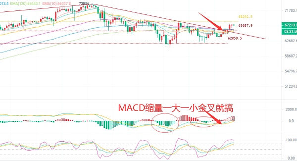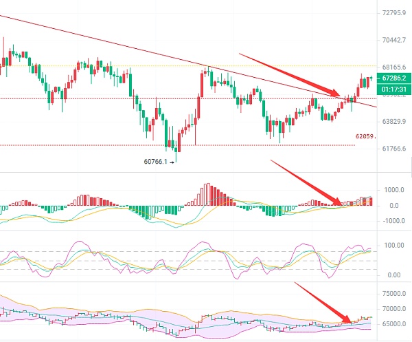 从日K线来看,当前多头趋势非常强劲,K线突破趋势压力位EMA10(66600)。上方关注近期高点68000附近的阻力。短期内,跟随趋势将有一波不错的盈利空间。MACD显示主力正在增筹,DIF和DEA高位收口,可能难以跌破0轴下方。K线突破66600压力位后,KDJ形成向上金叉。布林带中轨成为第一压力位67800,但从盘口来看,这个位置的压力并不强。需关注68000整数关口以及历史高点。
