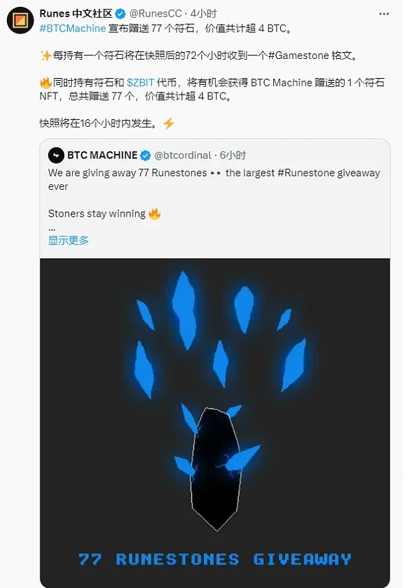 2024年3月22日 BTC Machine 发文宣布赠送 77 个符石,价值共计超 4 BTC。