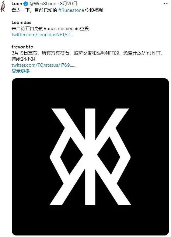 2024年3月20日,Loon 发文《盘点一下,目前已知的 Runestone 空投福利》。