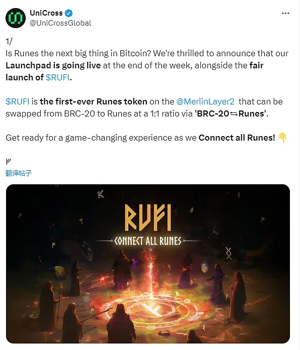 $RUFI 将是梅林链上的第一个 Runes 代币,在 Runes 协议上线后可通过 BRC-20⇄Runes 实现 BRC20 代币和 Runes 代币的1:1转换。同时,UniCross 后续还将支持 Runes 资产的铸造和 Runes 协议索引。