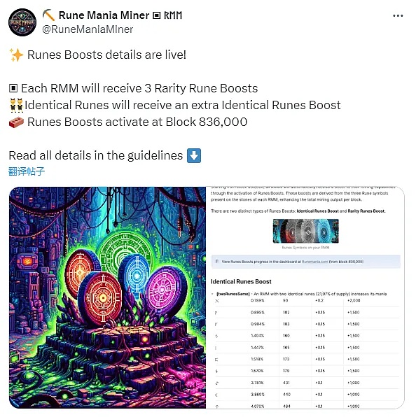 2024年3月21日 Rune Mania Miner 的符文矿机加速器细节已出,加速器的分配取决于每个 RMM 石头上的三个符文符号。