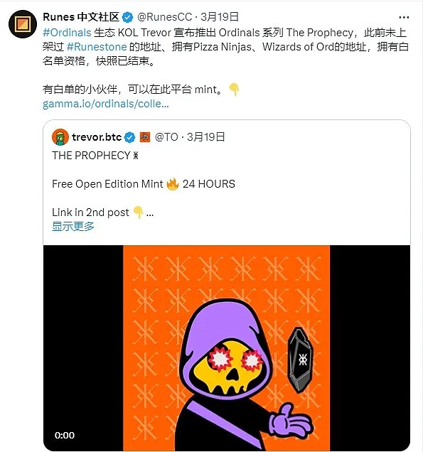 2024年3月19日,Ordinals 生态 KOL Trevor 宣布推出 Ordinals 系列 The Prophecy,此前未上架过 Runestone 的地址、拥有 Pizza Ninjas、Wizards of Ord 的地址,拥有白名单资格。