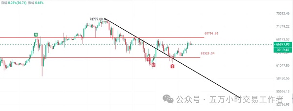 BTC行情分析:行情和我们前天说的差不多周末两天etf不出货,有了一个不错的反弹,直接从63000美元反弹至67268美元,收在了67290美元,目前价格在66550美元附近,又回到了我们前期的盘整区间