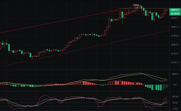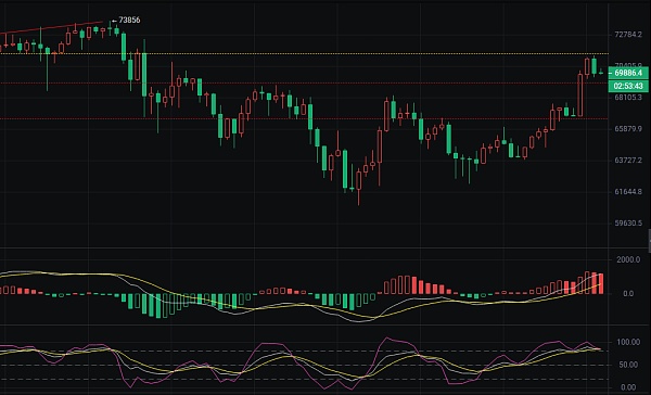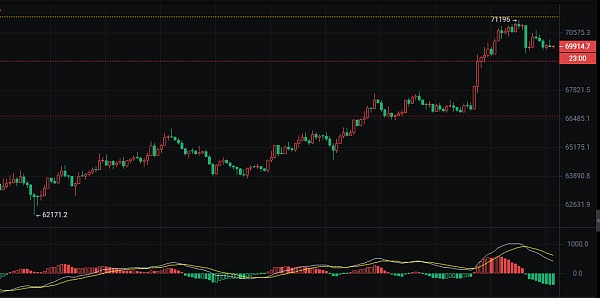 闲话少说来看盘口目前盘口日K线再一次站在EMA上方,MACD可以看到主力缩量增筹比前一日要多很多,DIF和DEA受影响高位向上收口,昨日日K线最高冲上了71000附近,那么今日还是会破昨日的高点,KDJ向上从66600金叉成型以后向上扩散,到目前为止一直是多有趋势,