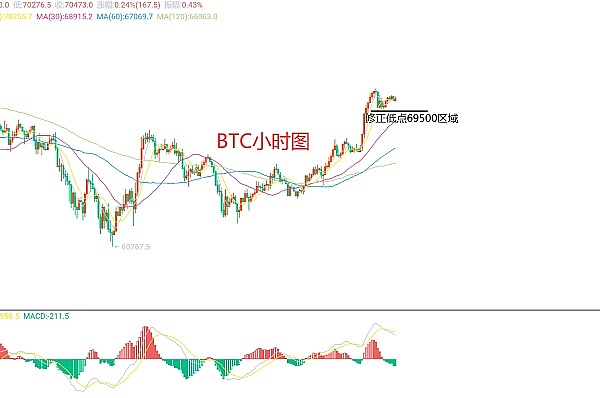 3月26日比特币(BTC)合约技术面分析:今日方面,大周期日线级别昨日报收小阳线,K线形态上连阳上涨,价格在均线上方,附图指标空头缩量运行,这样来看整体走势会陷入区间震荡走势了,昨日虽说出现较大涨幅,但在没有突破前期高点之前就需要关注延续性,所以不能过分看涨,这是规律;短周期小时图昨日欧盘前上涨,美盘延续上涨破高凌晨延续,今日早间承压但回撤力度不大,低点69500区域附近,当前价格在高位盘整,附图指标死叉运行,日内还有修正的需求,因此今日BTC短线合约交易策略:回撤69800区域多,止损69450区域,目标看70800-71000区域;