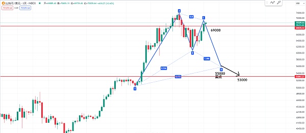我们可以观察一下D点的买点会不会在这个55000附近 当然这个形态目前也是没有形成 或者如果他不是一个看涨加特利 万一从目前的这个位置跌下来的话 我们就要提防的一点就是69000不能够被跌破 万一下来的话那D点的位置如果是一个看涨蝙蝠