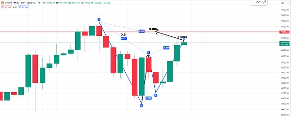 我们先来看一下比特币日线级别 那么这一次比特币从73000的高点跌到了这个位置 或者是目前又涨到了大约71000附近 我感觉也是有一个看跌的谐波形态 到底是看跌加特利还是说是一个蝙蝠形态 现在也不好猜测 那么我们就尽量看空间