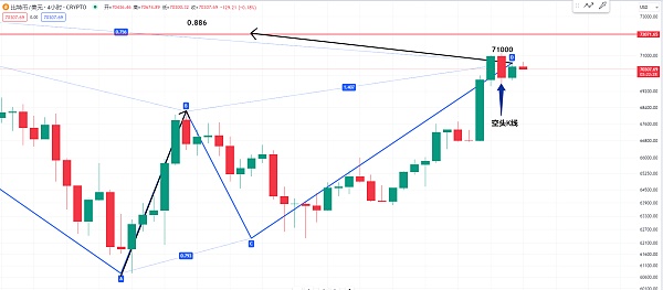 那我们可以观察一下4小时级别的结构 那么4小时级别昨天是涨到了71000附近 昨天是有一个空头K线 那我认为如果这个谐波的形态要化解 那么这一根空头K线一半的位置在短线内就一定要突破