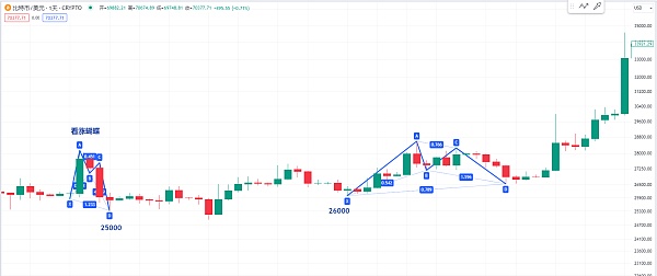 或者我们可以看一下更早之前 比特币当时从32000跌到了25000的低点 当时我也是有讲过这个位置我坚定看多 而且这个位置也是有一个看涨蝴蝶形态 或者是后面比特币盘整到26000的低点