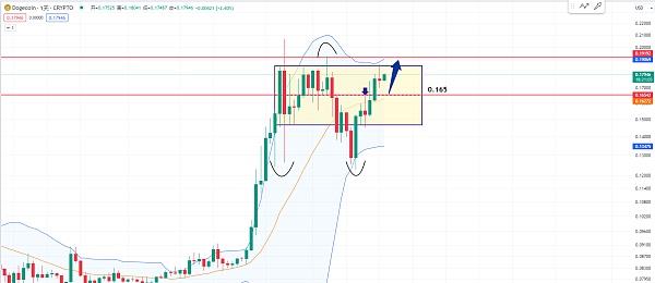 在日线级别布林带的下轨有可能就是支撑 那么上轨的位置有可能就是短期的压力 那布林带中轨的位置也是接近狗狗币这个箱体的一半 目前还是在强势区 只要比特币稳住 狗狗币就会盘整到位继续向上突破 从而去挑战0.2甚至是今年有没有可能会达到1美元