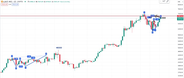 比如上涨的高点位置 大约是在48000美元附近也是有一个看跌谐波的形态 或者是看跌蝴蝶的形态 后面是有一个短期的下跌