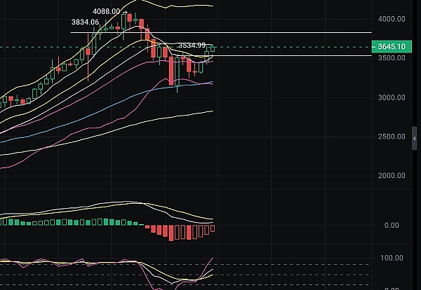 以太坊1小时-4小时数据跟大饼一个趋势;日线级别来看却在布林带中轨下方形成一点小阻力,看起来有点中气不足的感觉;MACD能量保持缩量上行,DIF已形成拐头趋势向上接近DEA,也将形成金叉现象;KDJ超买现象严重!综合上述指标来看,建议关注上方3675,3730这两个节点,破位后即可向上看到3830位置位置;下方关注3610,3545这两个关键支撑点不破接多即可;行情瞬息万变,建议仅供参考,请自行把握风控!
