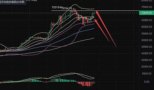 比特币1小时线价格在午间上方插针到71540后又展开回落,而后在EMA15与中轨交叉支撑点上形成反弹,布林通道正处于收口转态,MACD0轴下方能量增持,DIF在DEA下方继续向下;4小时线来看布林通道向上开口,币价处于EMA15与上轨区间,MACD能量继续放量,DIF保持在DEA上方向上扩散;KDJ交叉有意形成超卖现象;日线级别来看币价处于EMA7-EAM120所有均线之上,不断接近上轨位置;MACD能量缩量上行接近0轴,DIF已形成拐头趋势向上接近DEA,一旦形成金叉现象,那么币价一定会破位前高;再看KDJ超买现象严重;综合上述指标来看,币价在短时间内还会有一定的小回调,中期还是看涨趋势;下方建议关注70000,69300这2个均线位置可布局多;上方关注72100这个位置;不破则空,破位看新高!行情瞬息万变,建议仅供参考,请自行把握风控!