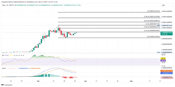 PEPE币的价格一直都以大幅上涨而出圈,为了下一次反弹冲高做准备。PEPE币在回调 35% 之后形成了更高的低点,并且重新测试了 0.000006302 美元的支撑区。