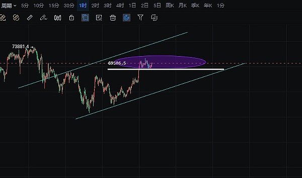 大饼。昨日至今持续走窄幅震荡,操作区间实乃较为低迷,欧盘冲高71600附近长影收回,晚盘探低失守7万关口也仅是虚晃一枪,整体结构依旧很稳。目前小时图来看,BOLL通道经过慢性横盘有所收口,昨日多次试探下轨附近屡屡收回,空间格局上偏于温水煮青蛙,附图方面MACD死叉之后开始走粘合,KDJ及RSI数值陆续给到企稳反冲,今日操作上,李隆建议高点上移,空仓的朋友回踩去分批多一次,进场切记做好分批风控计划。