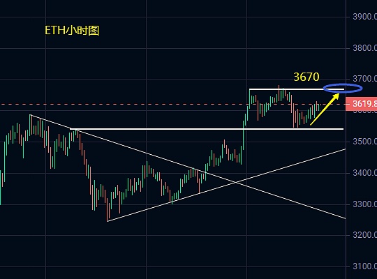以太坊,日线的看涨分水岭在3550,昨日刚好回踩此位置后反弹,日线高位十字星,调整形态;小时线构筑的上行趋势维持良好,日内下方首要还是关注3550的支撑,此位置一旦失守的话,短线上多头就会遇到麻烦;上方压制点集中在3650-3670,目前大趋势会推动币价上行,但是短线能够以什么样的方式涨,还得看阻力位的突破情况,下方支撑3550-3580,日内围绕此区域布局多。
