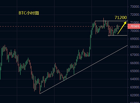 短线,无论是文章还是博文的分析,都在提示做多为主,尤其在晚间连续两次围绕69600做多基本都卡在了最低点,收获颇丰;今日,有理由继续看涨,其一是昨日美盘的回撤没有直接跌破69000关口,而是反抽后早间重新突破70000关口,其二日线继续连阳,多头趋势良好;小时线首要关注昨日71200一线的短线阻力压制,整体依托70000做多看涨。