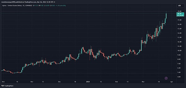 尽管最近整个加密货币市场的价格出现调整,但 Aptos 的 APT 代币自 3 月初以来一直处于令人印象深刻的上涨趋势。过去30天内,该代币涨幅超过94%,展现出强劲的表现。