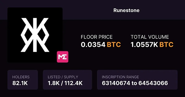 Leonidas 将 Runestone Memecoin 高调定义为 Meme 符文,其 Ordinals NFT 空投最高冲破 0.055 $BTC ,市值超 4 亿美金。