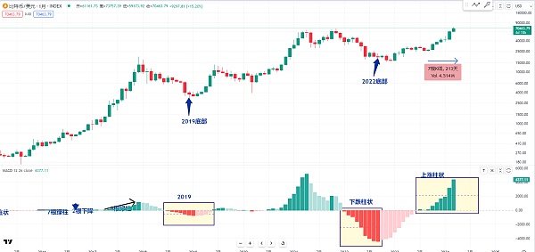 所以我们来看一下比特币月线级别的macd指标 那么这一次的比特币在月线级别里面已经是连续大涨了7个月 那在前一段时间我也有在视频里面提到 下方的这个macd柱状在7根左右 有可能就要小心了