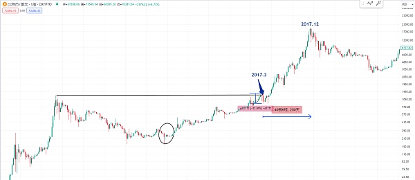 或者是我们再看一下比特币在2015年的牛市 底部涨上来到了2017年3月份左右 当时这个位置突破了历史新高 中间也是有一个很大的跌幅 这个位置跌了接近35%