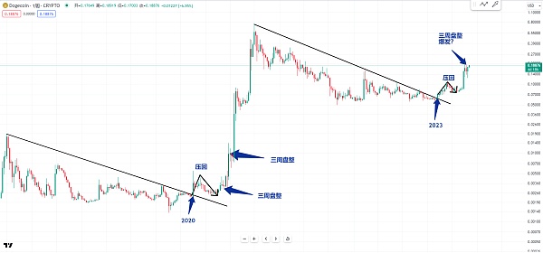 然后我们再来看一下狗狗币周线级别 那么狗狗币在2023年的这个位置趋势突破之后在这个位置压了回来 和2020年的这个位置也是一样 在长达两年的趋势突破之后 他也是有一次回撤 那最近有没有可能会在短期之内马上突破0.2