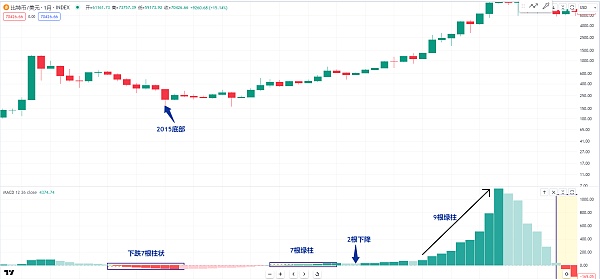 或者我们可以看一下2015年的底部 macd连续下跌7根 那么这里就是2015年的底部 然后我们可以参考一下比特币在2015年的牛市 可以去数一下2015年macd的柱状 一般6到7根的时候就要注意会不会有像这种两根的柱状下降