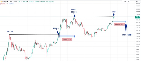 所以我们通过了比特币周线级别的图表 或者是之前我也有考虑过另外一个比特币顶部的时间有没有可能会在2024年的12月份 那我们可以观察一下比特币就这一次突破了历史新高69000