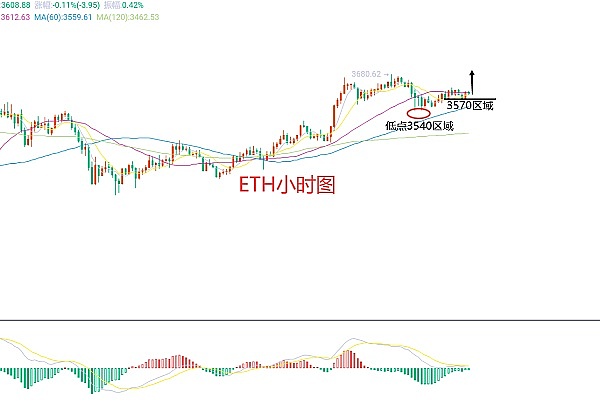 3月27日以太坊(ETH)合约技术面分析:今日方面,大周期日线级别昨日报收小阴线,K线形态上连阳单阴,价格在均线上方,附图指标死叉缩量运行,昨日的整体走势还是震荡区间,价格在美盘回撤,凌晨以及早间支撑反弹,从技术指标上来看并没有出现明显的上涨或者下跌的延续,这样来说后市价格可能还是会维持在区间震荡内了,短周期小时图昨日美盘回撤低点3540区域附近,高点3630区域附近,今日看延续上涨的话那么价格回撤不能破地点,否则难涨,所以欧盘是重点了,因此今日ETH短线合约交易策略:回撤3570区域多,止损3540区域,目标看3615-3630区域