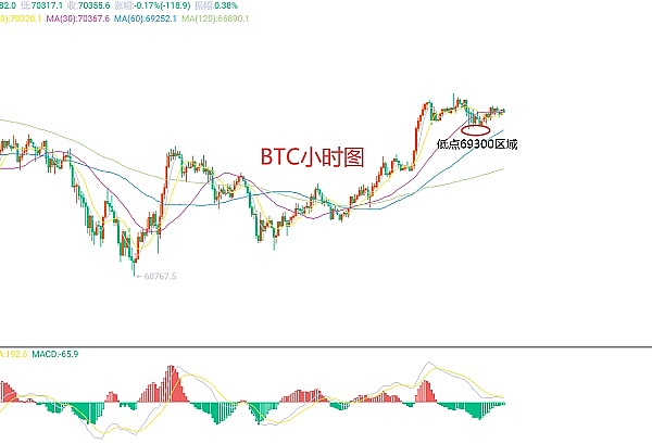 3月27日比特币(BTC)合约技术面分析:今日方面,大周期日线级别昨日报收小阳线,K线形态连阳上涨,价格在均线上方,附图指标死叉缩量运行,快慢线油粘合金叉迹象,但 还需要关注后市的上涨力度以及延续性才能明显,高点73800区域,低点60800区域这是当前日线级别的大区间高低点;短周期小时图昨日美盘下跌低点69300区域附近,凌晨及今日早间支撑反弹,当前价格在高位震荡横盘整理,今日如果要看延续上涨,那么昨日低点是一定不能破的,否则还是震荡;因此今日BTC短线合约交易策略:回撤69700区域多,止损69350区域,目标看70700-70800区域;