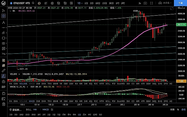 以太坊前期回踩3000关口确认底部后整体呈一个震荡上行的走势,高位触及3680一线受阻回落,低位跌至3543支撑再次反弹,恭喜跟上低多思路的朋友获利八十点,目前币价在3620附近运行,四小时级别如思路一致上方承压明显,多头逐步缩量且走出回落,但空间有限,目前处于区间震荡走势,短期3670阻力3560支撑,白盘走势缓慢多看少动等待机会,日线级别整体受ma30均线压制,虽有突破却没能站稳,但并不妨碍大方向走势,底部已经确认且逐渐抬高,突破是迟早的事了,低位筹码拿好等待上涨就行了,思路不变低多为主高空为辅,上方压制3680-3780,下方支撑3560-3500